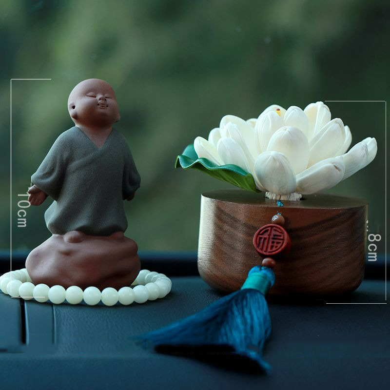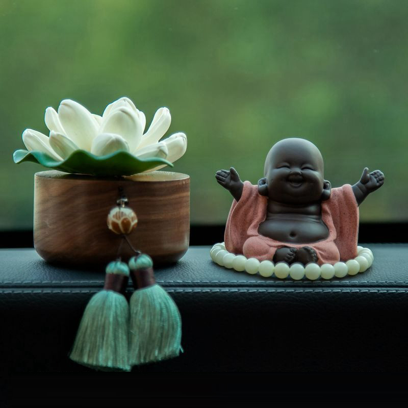 Bộ tượng Phật bên hoa sen để trên ô tô